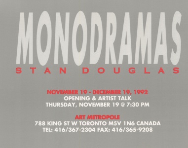 Stan Douglas videotape screening of Monodramas. Features ten 30 to 60 second television interventions previously aired on cable TV. Artist’s talk on 19 November. Ranged from 11/19 – 12/19.