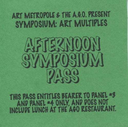 Held at Jackman Hall, Art Gallery of Ontario and organized in collaboration with the gallery. Speakers: Cornelia Lauf, Imschoot uitgevers, Ghent; Brian Butler, Brain Editions, Vancouver and Santa Monica; Leta Stathacos, Albright-Knox Gallery, Buffalo; John Goodwin, Shark Editions, Toronto/New York; Roger Bywater, Art Metropole; and others. Performance following the symposium by Keith Hennessy, at AA Bronson’s Colonnade Penthouse, 131 Bloor Street West. Micah Lexier’s multiple Older Brother Younger Sister published as a gift to symposium participants. The exhibition MANAGING: documents 1967-1974 organized as a complementary event. Symposium passes: 5 versions, 3 copies of each. Ranged from 09/29 – 09/30.