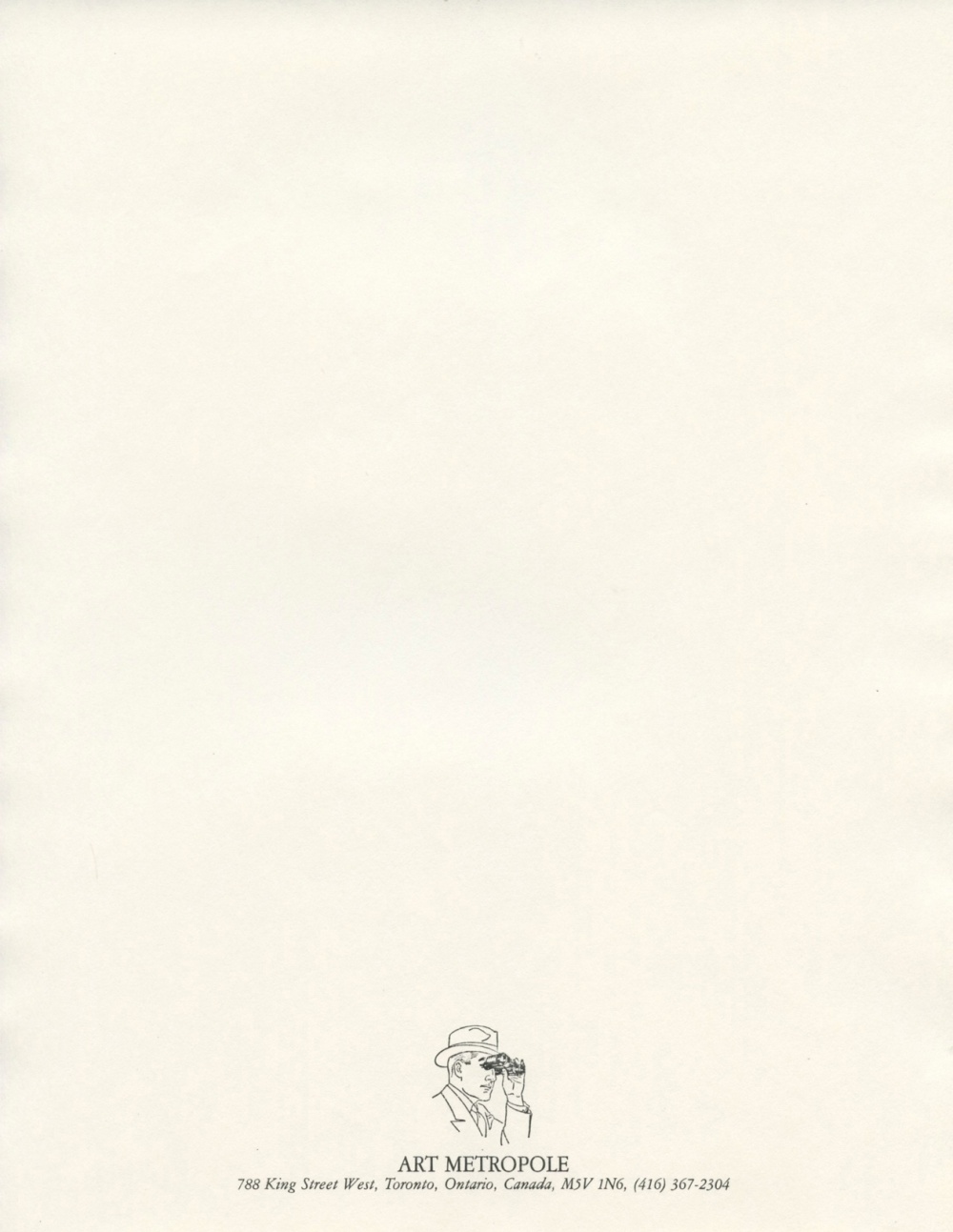 Used during 1988-94, it was initially created for Art Metropole’s new location, 788 King Street West, Toronto. Designed as an artist’s project, it features one of a series of ten different found images at the bottom of each sheet of letterhead. Reproduced by photocopy on vellum or regular paper.