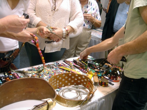 4: Sandy Plotnikoff making snap and foil belts in front of guests.